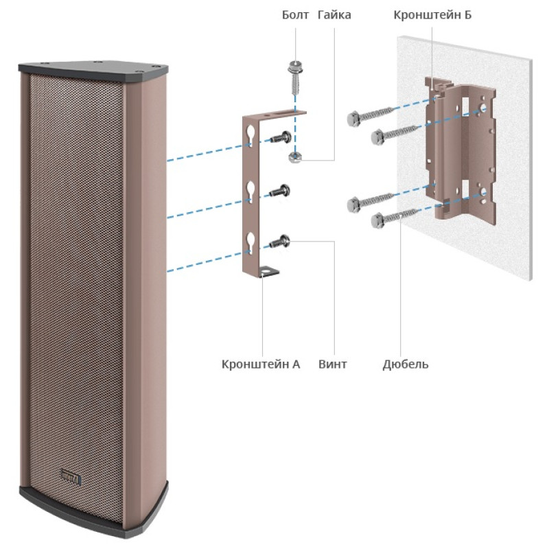 Конструктивно колонный громкоговоритель выполнен в алюминиевом корпусе IP65 с защитой решеткой из оцинкованной стали и предполагает напольное размещение или лепление на стену с применением комплектного поворотного кронштейна. Внешне корпус покрыт составом цвета «коричневый металлик», который надежно защищеает корпус от каррозии, выгорания и деформаций. За качественный звук отвечает связка из четырех 4" динамиков с диффузорами из полипропилена и 1" твитера. Для подключения к трансляционным линиям 70/100 В предусмотрен согласующий трансформатор, отводы которого выведены на встроенную клеммную колодку. Подвод кабеля к колодке осуществляется через 2 гермоввода.