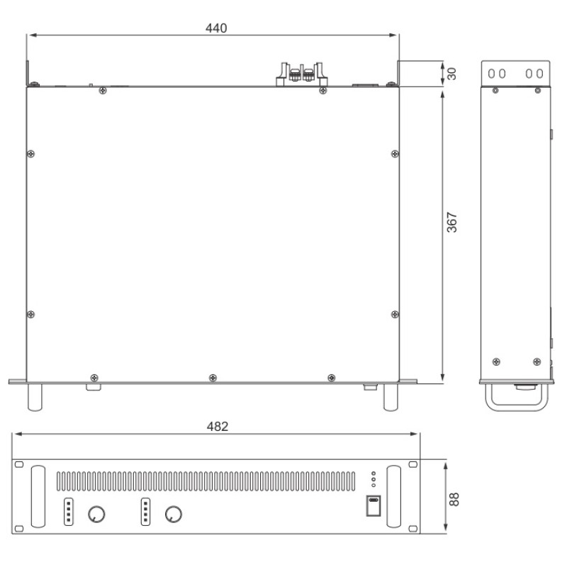 - 2 независимых канала мощностью по 300 Вт каждый, обеспечивающие возможность организации двухзонных систем с возможностью трансляции как общих, так и различных сигналов.