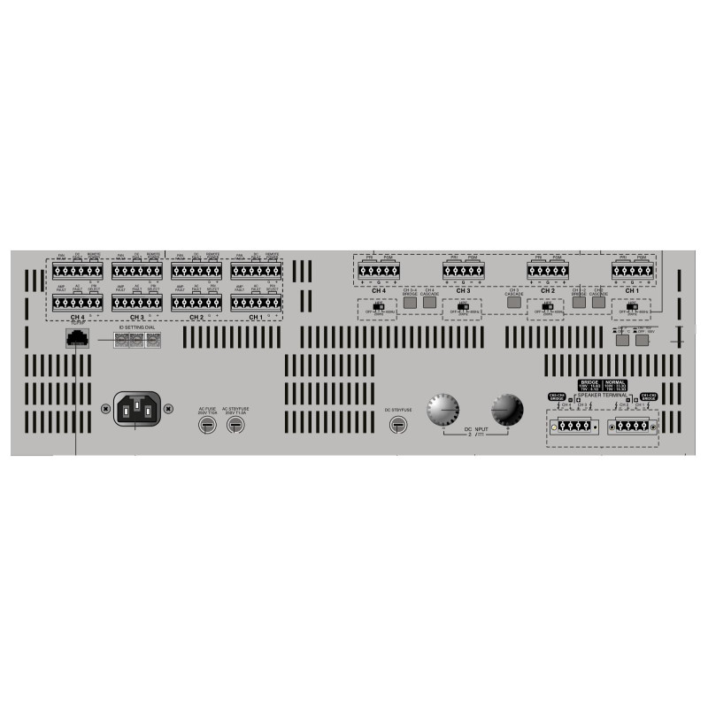- В усилителе предусмотрено питание 220В АС и 24В DC для подключения аккумуляторов или системы резервного питания.