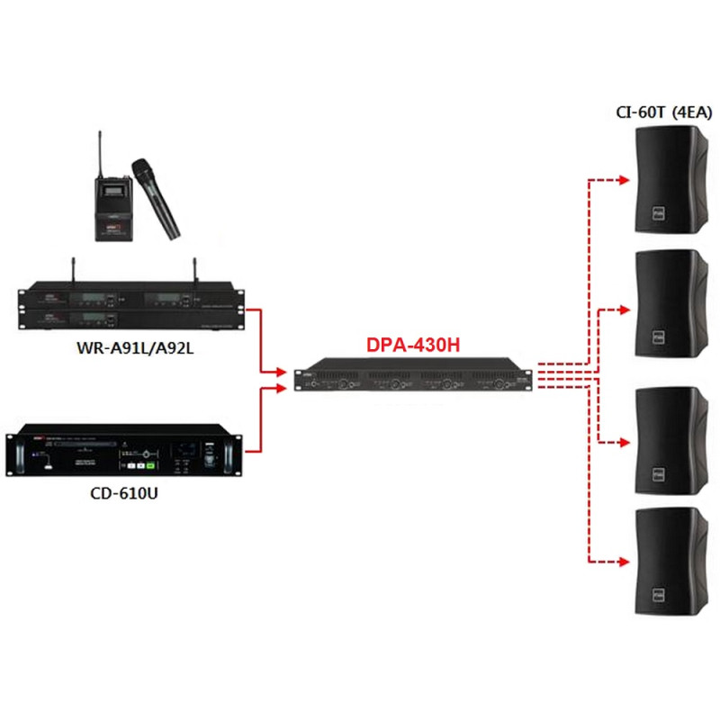 Цифровой усилитель мощности DPA-430H мощностью 4 канала по 300Вт каждый. Выходное напряжение 100В. Усилитель является цифровым (класс D), что позволяет обеспечить высокую надежность и КПД при малых габаритах устройства.