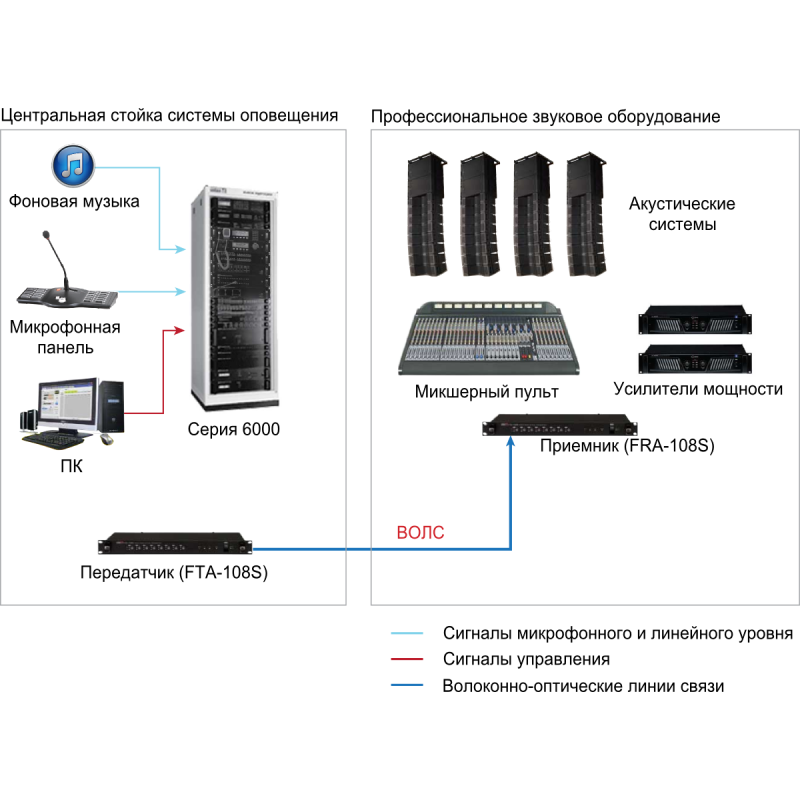 Блок FRA-108S применяется при организации распределенных многосегментных и многоканальных систем оповещения и служит для приема аудиосигналов по волоконно-оптическим линиям связи. Позволяет объединить несколько филиалов, спортивных комплексов, производственных цехов, расположенных в разных районах или городах, для организации общей системы озвучивания и громкой связи.