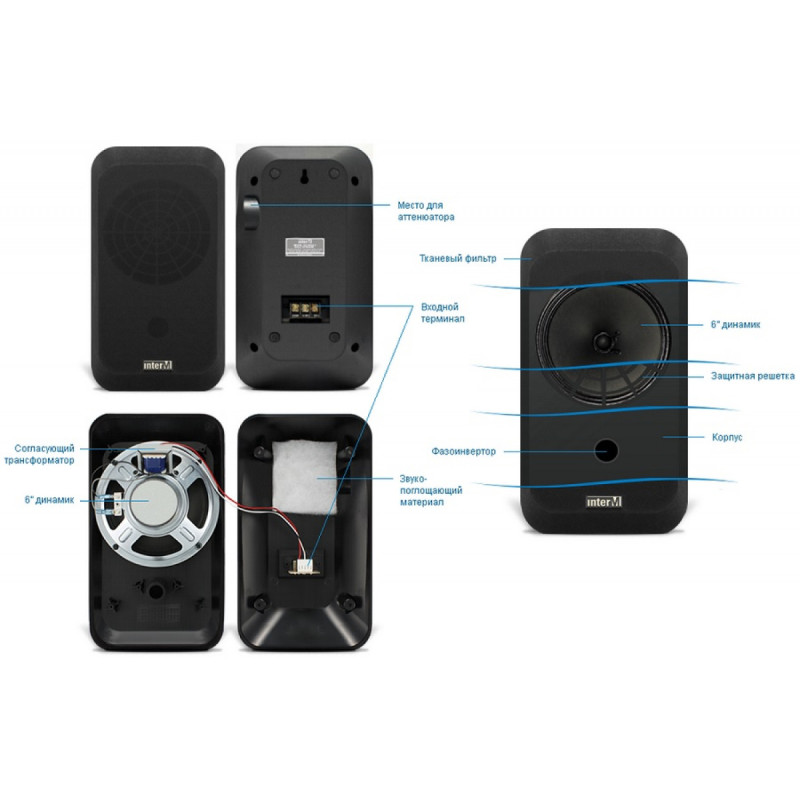 Устройство имеет встроенный аттенюатор. Конструкция акустической системы предусматривает установку внутри помещений. Материал - пластик, цвет корпуса - черный. Инсталляция: навешивается на стену при помощи петли на задней стенке корпуса. Возможность работы на линиях напряжением 70 и 100 В.