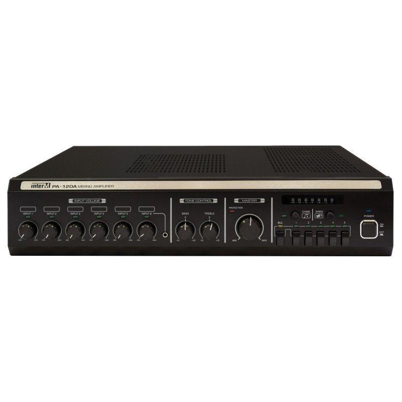 Inter-M PA-120A – 5-зонный цифровой микшер-усилитель с выходной мощностью 120 Вт, применяемый для построения зональных систем музыкальной трансляции и оповещения небольших объектов (кафе, магазины, салоны красоты и др.).