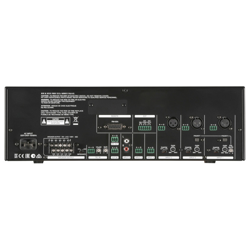 В устройстве предусмотрены возможность подключения модулей: USB/CD проигрывателя PAM-CDU, FM тюнера PAM-FMT, USB/SD проигрывателя PAM-SDU, USB/Bluetooth плеера PAM-BTU и медиапроигрывателя PAM-MPM4A, возможность подключения удаленной микрофонной панели RM-05A, кнопочный селектор на 5 зон, микросхема голосового файла с записанным тревожным сообщением, возможность подключения прибора ОПС, 3 универсальных и 3 линейных входа, балансный вход для телефонного пейджинга, 2-полосный эквалайзер для выходного сигнала, светодиодные индикаторы уровня выходного сигнала и срабатывания защиты, генератор сигнала 'ГОНГ'. Первый и второй микрофонные входы могут назначаться приоритетными.
