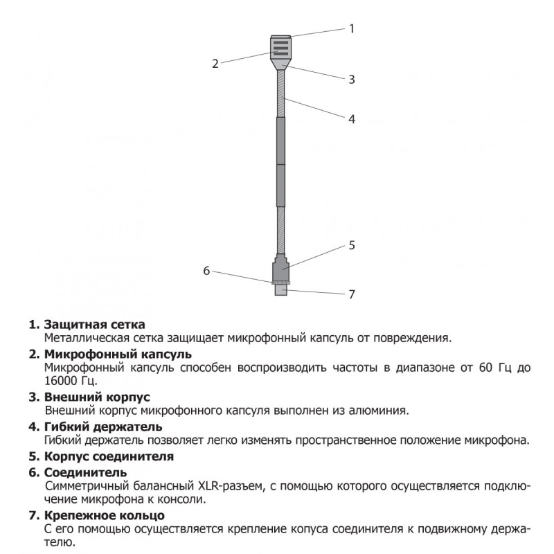 Конструкцией предусмотрены кнопка включения и разъем типа XLR, к которому подключается микрофон.