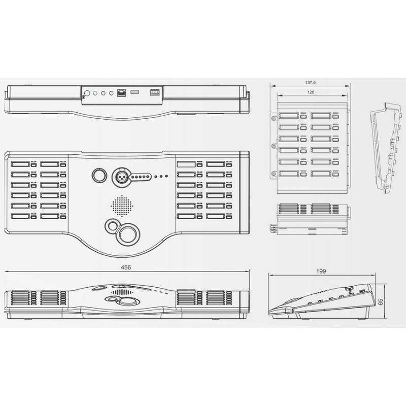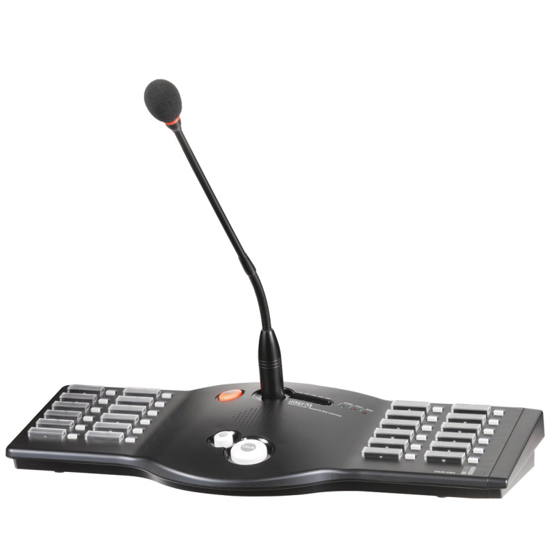 Настольная микрофонная панель RM-6024 создана для трансляции сигнала ГОНГ и речевых команд диспетчера в 24 зоны оповещения совместно с контроллером ECS-6216P или PX-6216. Каждая из 24-х кнопок прибора программируется на определенную линию СОУЭ либо их группу, что дает возможность осуществить необходимый алгоритм работы системы. Возможность расширения на 12 или 24 зоны реализуется с помощью подключения одной или двух клавиатур RM-6012KP соответственно. Закрепить одну зону или группу из нескольких зон оповещения (160 максимум) за одной кнопкой можно при помощи персонального компьютера и соответствующего программного обеспечения.Гибкий микрофонный держатель содержит в себе конденсаторный микрофон и светодиодный индикатор. Рядом расположена группа светодиодов зеленого, желтого и красного цвета, которая указывает на уровень громкости выходного сигнала. Также присутствует индикация состояния микрофонной панели и активности зоны оповещения.