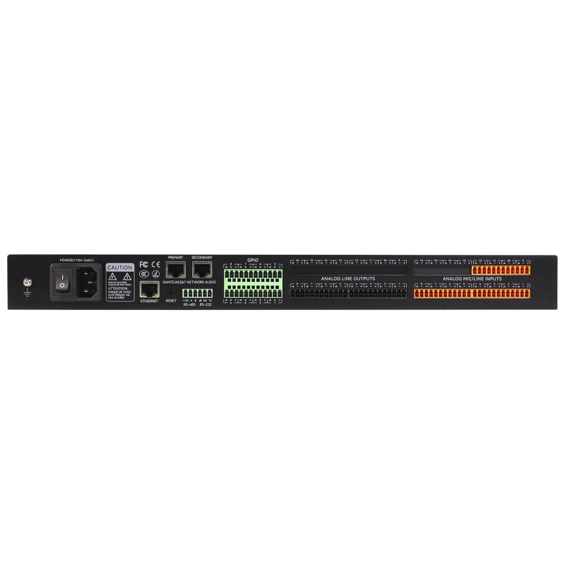 ITDSP-FLEX1208D имеет поддержку аудио Dante / AES67 32x32 каналов, primary и secondary порты для целей резервирования, управление через отдельный порт Ethernet, а также дополнительные 8 многофункциональных портов GPIO.