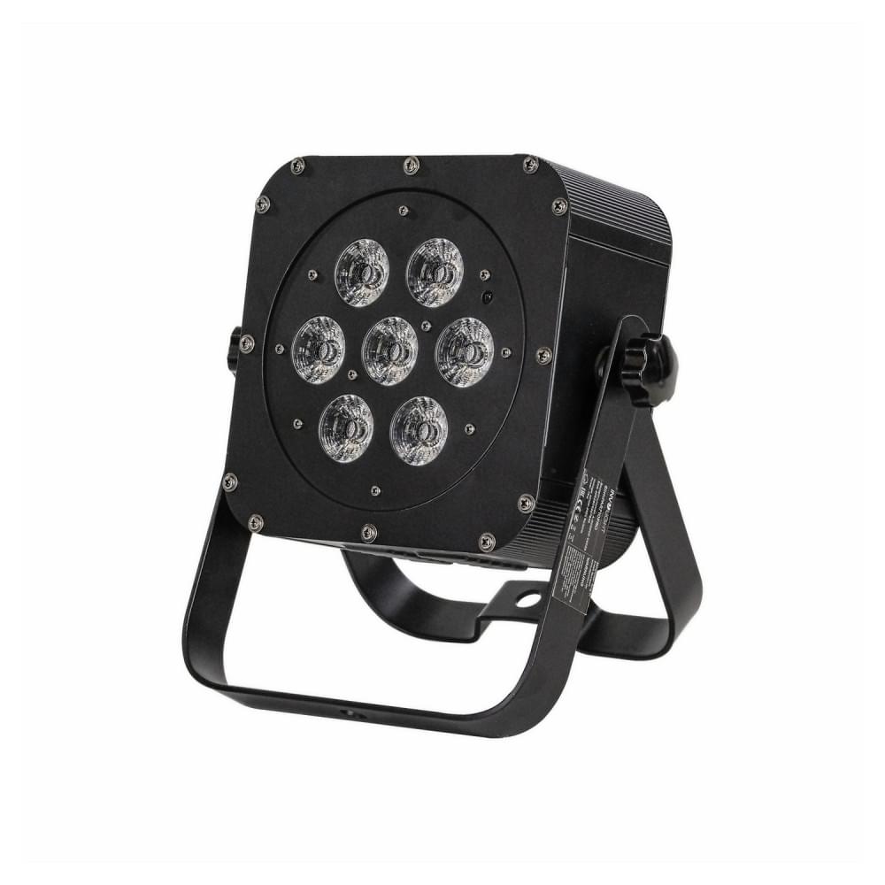 Прожектор оснащен 7 яркими светодиодами RGBWA / UV 6-в-1 мощностью 10 Вт каждый. Угол раскрытия луча составляет 40 градусов. Прожектор управляется по стандартному протоколу DMX - доступно 6,7,8,9 или 11 каналов. В режиме DMX доступны функции Мастер диммер, смешивание цветов, изменение цвета, цветовые макросы, стробоскоп, авто программы и звуковая активация. Автономно доступны функции смешивание цветов, изменение цвета, статичные цвета и стробоскоп, а также режимы авто программы, звуковая активация и Master/Slave. Для удобства управления устройство имеет 4-сегментный LED дисплей и 4 клавиши: Mode, Setup, Up и Down. Для коммутации используются стандартные DMX разъемы 3-pin XLR. В комплект поставки входит также многофункциональный кронштейн для установки и пульт дистанционного управления. Данная модель идеально подходит для создания качественной световой заливки, а также впечатляющего многоцветного шоу в задымленном пространстве.