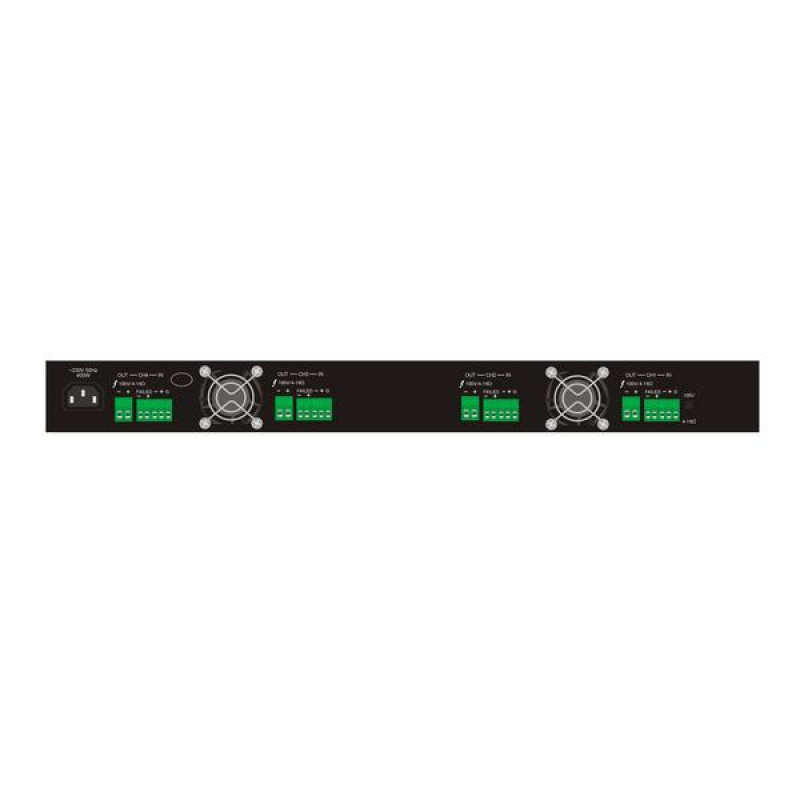 Устройство обеспечивает номинальную выходную мощность 4 x 240 Вт и оснащено усилительной схемой класса D с энергоэффективным импульсным источником питания. Внутренняя компоновка рассеивания тепла позволяет усилителю работать при температуре ниже 55 градусов в чрезвычайно суровых рабочих условиях. Корпус устройства изготовлен из прочных металлических материалов, а также его можно монтировать в рэковую стойку, где он занимает 1U. Усилитель имеет два режима работы, между которыми можно переключаться: низкоомное подключение на 4 -16 Ом и для трансляционных 100-вольтовых линий.