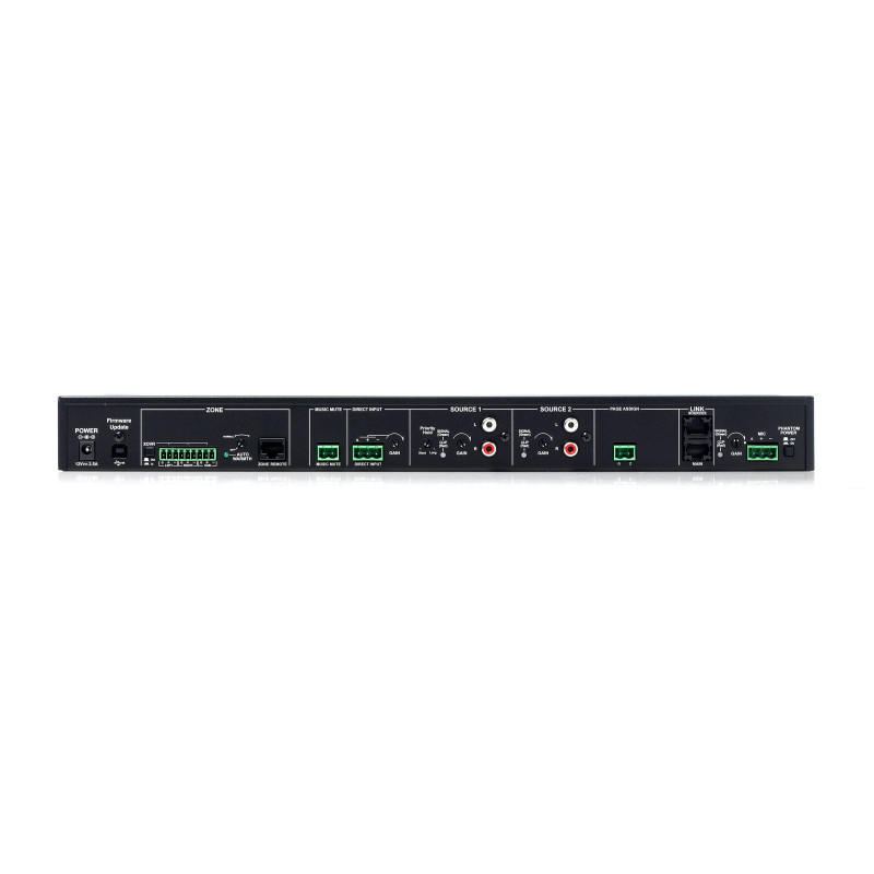 2x1 стерео/Моно PA микшер. 2 стерео RCA входа; 1 мик. вход; 1 лин. приоритетный вход; 1 стерео выход (+выход на сабвуфер).