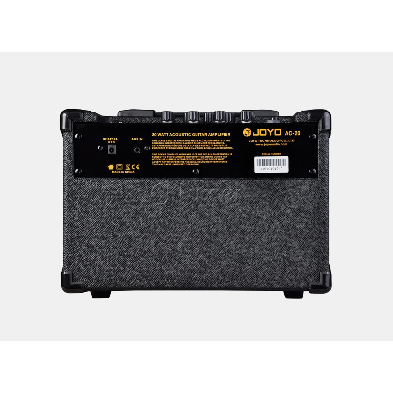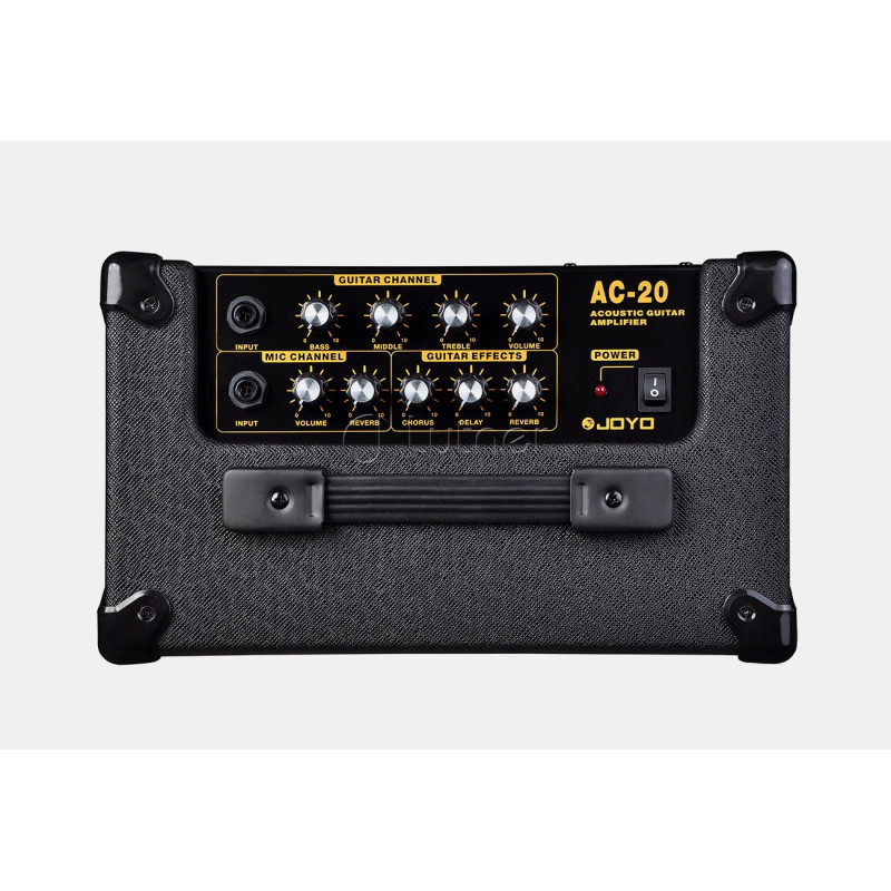 Профессиональная аудиоаппаратура небытового назначения JOYO AC-20 - усилитель, разработанный со схемой усиления специально для акустических гитар, благодаря этому звук характеризуется красивымы и яркими высокими частотами с богатыми средне-низкими частотами. Мощность 20 Вт (10 Вт + 10 Вт) достаточно и для небольших живых выступлений. Гитарная часть AC-20 имеет 3 встроенных DSP-эффекта: Chorus, Delay и Reverb. Все эффекты могут использоваться одновременно.