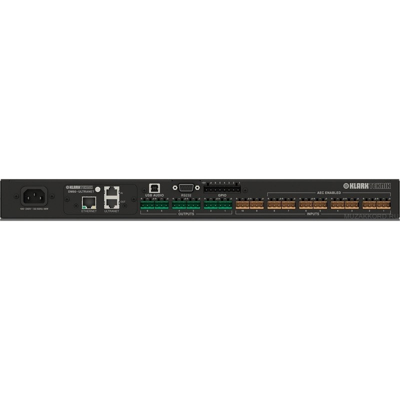 KLARK TEKNIK DM8000 процессор для систем звукоусиления. Процессор Klark Teknik DM8000 представляет собой 1U устройство, все параметры которого программируются с компьютера. Модель получила мощное оснащение как по набору алгоритмов, так и по количеству установленных разъемов. В устройстве предусмотрено 10 микрофонных входов, 8 из которых имеют функцию подавления эха Acoustic Echo Cancellation (AEC), используемую в телеконференциях. Также процессор оборудован шестью аналоговыми выходами. В качестве межпроцессорного цифрового интерфейса предлагается 16 входных и выходных каналов через карту Ultranet I/O. Кроме этого, есть встроенный 2-канальный аудио USB-интерфейс. Таким образом, общее количество входов DM8000 составляет 28, а выходов – 24. Для связи с внешними панелями управления предусмотрены интерфейсы RS232 и GPIO. Программировать новый процессор можно с помощью софта "DM8000 DSP Designer", который имеет стандартный для такого рода устройств инженерный интерфейс.