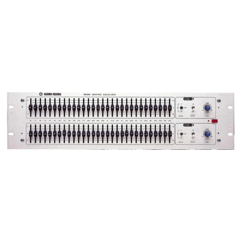 KLARK TEKNIK DN360F - 30 полосный 1/3 октавный стерео эквалайзер. Klark-Teknik предлагает принципиально новый подход к эквализации на основе собственной схемы Proportional-Q (пропорциональная добротность), гораздо более гибко воздействующей на музыкальный материал. При небольших значениях коррекции усиления в полосе, добротность фильтра небольшая, что позволяет бережнее подходить к изменению общего тонального баланса фонограммы. Если степень коррекции в полосе увеличивается или уменьшается, то увеличивается и добротность, сужая полосу пропускания. Это более соответствует ситуации, характерной для точечной глубокой коррекции отдельных проблемных частот. Модель DN360 имеет также встроенный обрезной ФВЧ 30 Гц, для удаления инфранизких частот. Кроме стандартной версии, может поставляться с конфигурируемым выходным разъёмом (DN360-P2H), установленным выходным трансформатором (DN360B) или с входным и выходным трансформатором (DN360F).
