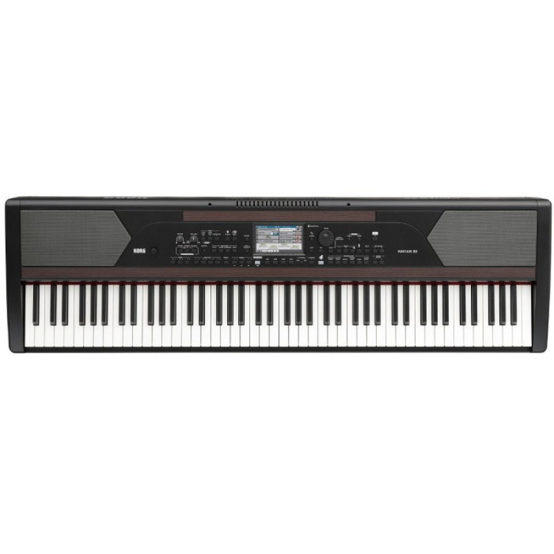 Korg Havian 30 цифровое пианино, 88 клавиш фортепианного типа с разной утяжеленностью, полифония 128 голосов, более 950 пэтчей, 240 перфомансов, 256 пользовательских пэтчей и 128 пользовательских наборов ударных, 420 пресетных и 1040 пользовательских стилей автоаккомпанемента, четыре процессора эффектов, 16-дорожечный секвенсор, рекордер (SMF, MP3), цветной сенсорный дисплей, два порта USB, встроенная система звукоусиления.