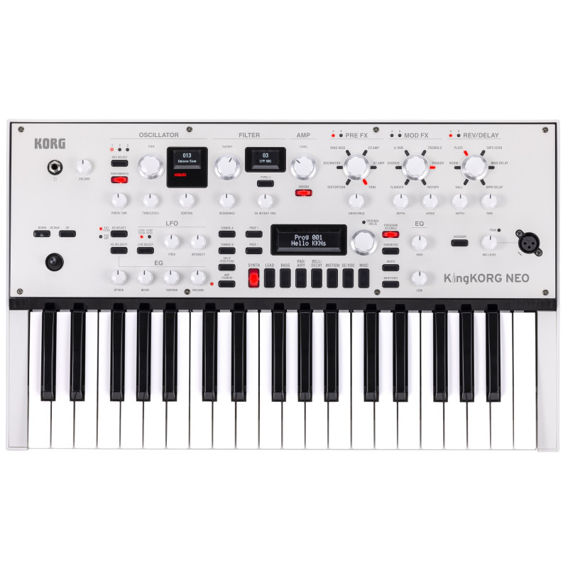 Модель NEO оснащена новым движком XMT (eXpanded Modeling Technology) с двухтембральностью и поддержкой до 24 голосов. Каждый слой содержит синтезаторный голос, состоящий из трех осцилляторов. Они основаны на заранее установленных алгоритмах, которые предлагают различные варианты синтеза. Инструмент предоставляет классическую пилообразную и квадратную пилообразную форму волны, а также интересные модели шума, типичные для аналоговых синтезаторов. Помимо 32 классических аналоговых волн, у пользователей есть 65 источников звука PCM и 40 DWGS. Отсюда звук поступает в многорежимный фильтр аналогового моделирования, включающий семь типов фильтров нижних частот, пять типов фильтров верхних частот и шесть типов полосовых фильтров. Здесь вы можете найти эмуляцию различных синтезаторов Korg, включая культовый фильтр Polysix и MS-20, а также фильтры, известные по цифровым синтезаторам KORG Modwave, Wavestate и Opsix. KingKORG NEO оснащен обширной секцией мультиэффектов с тремя слотами мастер-эффектов, каждый из которых предлагает шесть различных типов эффектов. Он включает в себя такие эффекты, как искажения, симуляция усилителя, фазер, хорус, реверберация, задержка и многое другое. Изюминкой нового KingKORG NEO является встроенный вокодер, доступный через балансный вход XLR на передней панели (микрофон в комплекте). Ядро вокодера состоит из сложного 16-полосного фильтра с расширенными элементами управления, позволяющего получить широкий диапазон звуков вокодера. Кроме того, каждый из трех осцилляторов можно выбрать в качестве источника для микрофонного входа. Эта уникальная функция позволяет синтезировать богатое сочетание голоса и инструментов, создавая инновационное и захватывающее сочетание тембров. Еще одна особенность KingKORG NEO новая система виртуальных патчей (шесть виртуальных патчей для каждого тембра). Их можно виртуально связать с управляющими сигналами, такими как огибающие, LFO или движение джойстика. Помимо этого, инструмент оснащен гибким встроенным пошаговым арпеджиатором и функцией автоматического создания фраз арпеджио на основе аккордов, которые исполняются в данный момент. Пользователь также может указать продолжительность, интервал и статус включения/выключения каждого шага, открывая широкий спектр ритмических возможностей. В комплект входит внешний блок питания, вокодерный микрофон и ветрозащита, а также ПО от Izotope и KORG.