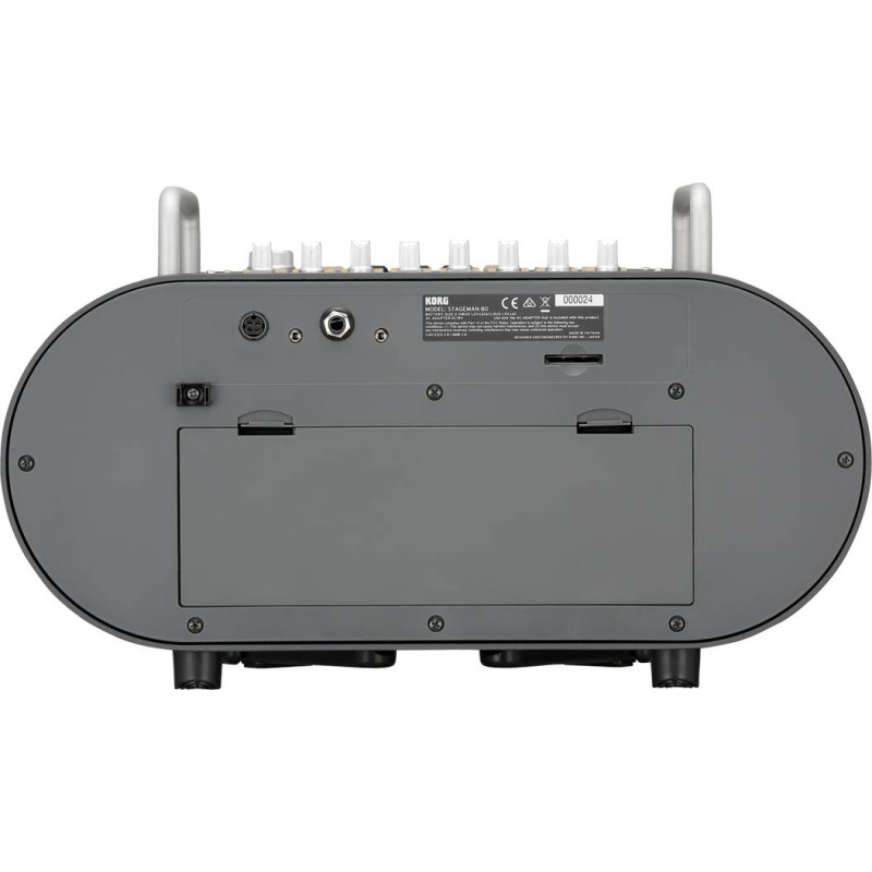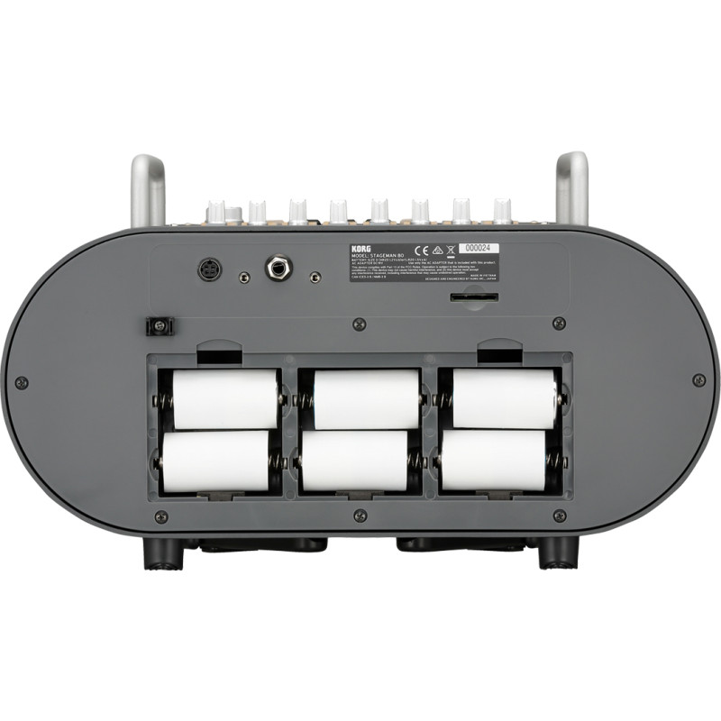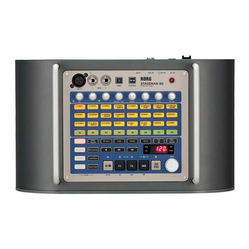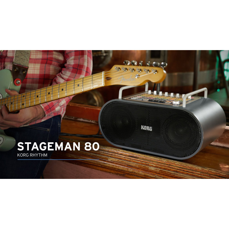 KORG STAGEMAN 80 представляет собой портативный мультифункциональный комбоусилитель. Комбоусилитель способен удовлетворит любые потребности гитариста во время живого выступления. Звуковая система представлена двумя 4-дюймовыми динамиками, общая мощность 80 Вт., а также усилителем класса D-класса (Class-D). Несмотря на свои компактные размеры комбо обеспечивает впечатляющий уровень громкости. С ним можно выступать даже на на площадках небольшого размера на улице. Устройство, кроме системы звукоусиления, оснащено интеллектуальной системой ритмических паттернов - Real Groove Technology. Паттерны включают в свой состав 24 стиля по 2 вариации, причем каждая вариация имеет 3 своих паттерна (базовый, fill-in 1, fill-in 2), реагирующие даже на изменение темпа игры. Ритмические петли охватывают весьма широкий круг музыкальных жанров, среди которых Cajon, Rock, Jazzи, Bossnova и многие другие. Комбоусилитель может полноценно выступать в качестве персонального живого барабанщика, а также в роли портативной систему звукоусиления благодаря встроенному микшеру, рекордеру и аудиоплееру.