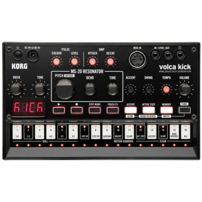 KORG volca kick аналоговый генератор из линейки Volca, специально разработанный для синтезирования звуков барабанов и баса. Аналоговая схема, использованная в конструкции этой модели, основана на оригинальном фильтре MS-20, выдающем мощный звук с великолепным резонансом. Volca Kick позволяет создавать широкий набор разнообразных звуков перкуссии и басовых инструментов, возможный только с использованием аналогового оборудования. Натуральный, мощный и сильный звук, создаваемый с помощью KORG volca kick невозможно получить, применяя плагины или сэмплы. 16-шаговый встроенный секвенсор с опцией Touch FX позволяет настраивать применяемые эффекты в режиме реального времени, что очень удобно для живых выступлений. Volca Kick – портативная модель: устройство весит 377 г., его размеры - 193 x 115 x 46 mm. Синтезатор может работать как от сети с помощью адаптера переменного тока, так и от батарей типа АА. Время непрерывной работы от 6 батарей – примерно 10 часов. Предусмотрен вход MIDI, вход и выход мини джек и разъем для подключения наушников.