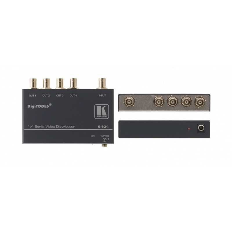 Kramer 6104 - многоформатный цифровой усилитель-распределитель 1:4 SDI. Он не нуждается в подстройке, имеет устойчивую АЧХ и функцию перетактрования на выходах, что позволяет ему формировать четыре последовательных цифровых выходных сигнала с низким уровнем джиттера. Устройство автоматически компенсирует ухудшение характеристик сигнала в коаксиальном кабеле 75 Ом (длиной до нескольких сотен метров, в зависимости от типа кабеля и формата видео). Любой из форматов видео (4fsc PAL, 4fsc NTSC, компонентного сигнала 4:2:2 и широкоформатного 16:9) распознается автоматически. Устройство позволяет работать и с 10-битовыми, и с 8-битовыми видео, автоматически распознавая длину слова. В комплект входит источник питания 12 В. 6104 относится к семейству DigiTOOLS - группе высококачественных и компактных приборов с оптимальным соотношением «цена-качество» и широким спектром применения.