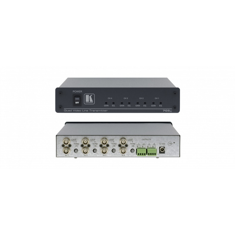 Kramer 703XL Передатчик 703xl предназначен для передачи композитных сигналов видео на удаленные устройства по витой паре (рекомендуется использовать неэкранированные провода). Устройство может использоваться в комбинации с приемником 706xl . 703xl оснащен четырьмя проходными видеовходами, сигнал с которых поступает на четыре независимых выхода (клеммные модульные разъемы). Каждый выход имеет регуляторы уровня сигнала и контроля АЧХ. Приемник 706xl , работающий в паре с передатчиком 703xl , имеет проходной вход для дополнительной коммутации (клеммные модульные разъемы, с переключателем эквивалентной нагрузки). Он также имеет регуляторы уровня сигнала и контроля АЧХ. При использовании высококачественных кабелей можно передавать полный диапазон цветных видеосигналов на расстояние до 1000 м. Вещательное качество сигнала (12 МГц) обеспечивается на расстоянии до 300 м. На меньших расстояниях поддерживается полоса пропускания сигнала до 30 МГц. Подобное устройство идеально подходит для организации системы дистанционного контроля. Оно служит альтернативой дорогостоящим оптическим или беспроводным передающим устройствам. При помощи адаптера RK-1 прибор устанавливается в стандартную 19'' стойку ( 2 модуля, занимаемая высота - 1 U). В комплект входит источник питания 12 B.