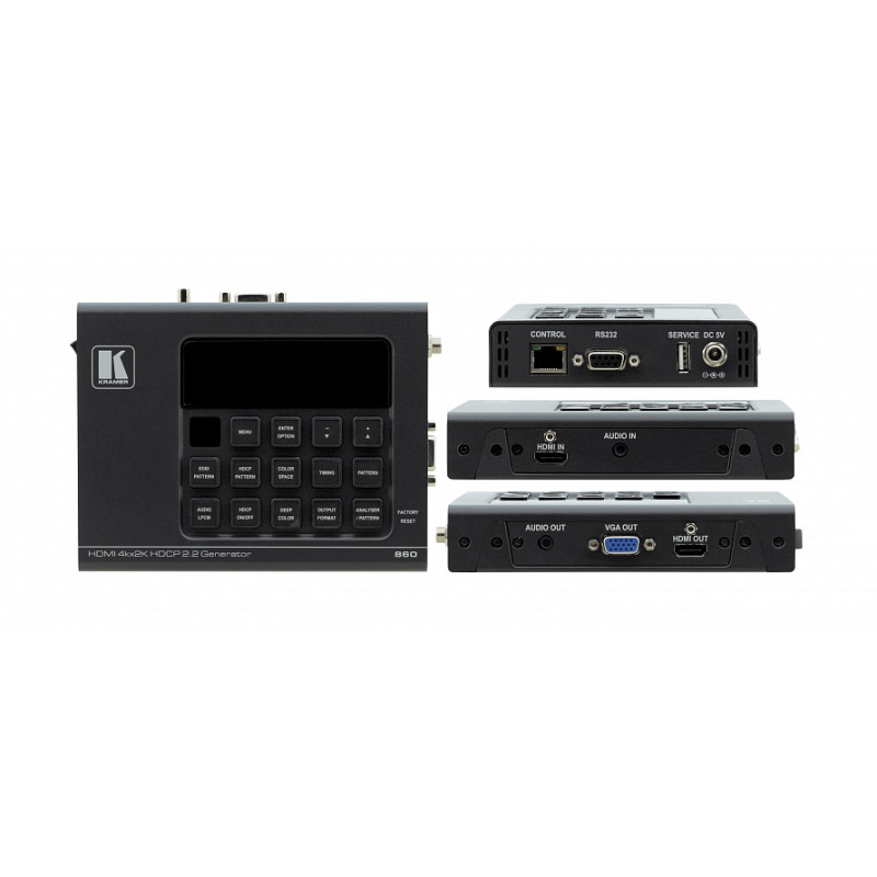 Kramer 860 Генератор-анализатор сигналов 860 HDMI 18G (6G на графический канал) – это компактный и удобный прибор, формирующий тестовое изображение и проверяющий работоспособность тракта с сигналами разрешением до 4K/60 Гц (4:4:4), поддержкой HDMI 2.0/HDCP 2.2. По умолчанию поддерживается 88 стандартных разрешений, предусмотрено 55 тестовых изображений и более десяти вариантов анализа AV-сигналов, что выводит прибор в лидеры среди прочих аналогов. Поддерживается пакетная передача данных HDMI, анализ блоков данных EDID и HDCP, а также загрузка и эмуляция EDID.