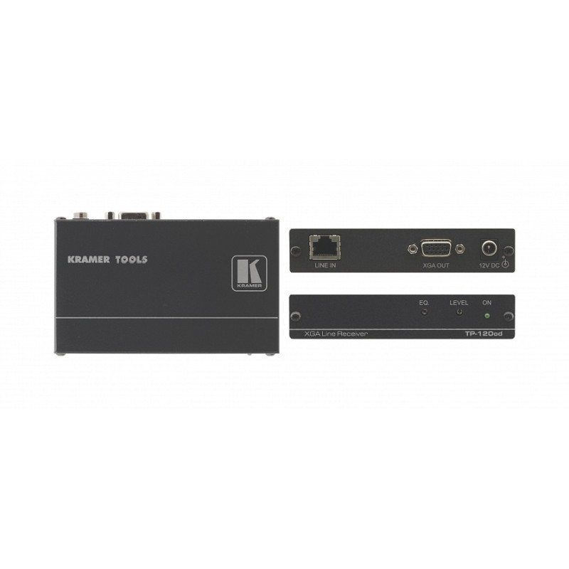 Kramer TP-120-OD - приемник компьютерного графического сигнала, передаваемого по кабелю на витой паре. Используется вместе с передатчиком Kramer PT-110-od или с другим совместимым передатчиком Kramer. Прибор выполняет преобразование принятого сигнала в исходный компьютерный графический сигнал. ВНИМАНИЕ! Подключение к активному оборудованию Ethernet может привести к выходу из строя всего оборудования. Для подключения используйте только совместимые приборы Kramer.