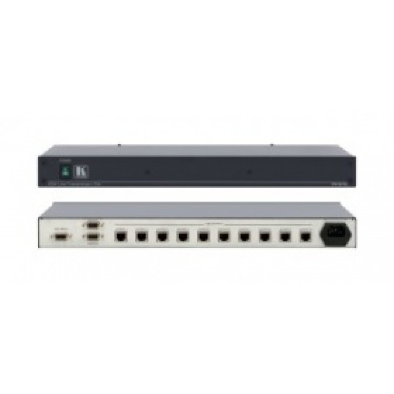 TP-210 — высококачественный усилитель-распределитель для компьютерного графического сигнала VGA-UXGA и более высоких разрешений. Сигнал, поступающий на единственный вход, распределяется на два выхода компьютерного графического сигнала с 15-контактными разъемами HD для местного мониторинга и на десять выходов на витую пару.