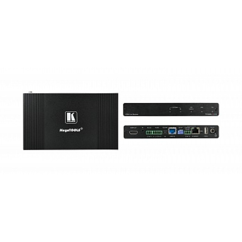 Наличие встроенного интеллектуального шлюза управления – возможность удаленного управления подключенными аудио-видео устройствами по IP посредством последовательной двунаправленной шины обмена данными CEC (через выход HDMI) или интерфейсов RS-232/ИК (через соответствующие выходные порты) с использованием локальной сети или линии HDBaseT. Данная функция упрощает и удешевляет инсталляцию, так как появляется возможность не использовать внешний шлюз, а также позволяет осуществить простую интеграцию с системами управления, такими как Kramer Control.