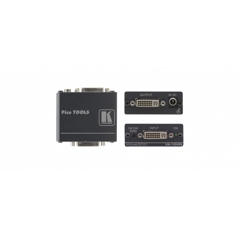 Kramer VA-1DVIN - эмулятор источника данных EDID интерфейса DVI-D. Прибор сохраняет в энергонезависимой памяти блок EDID устройства отображения информации, после чего тот может быть считан источником сигнала.