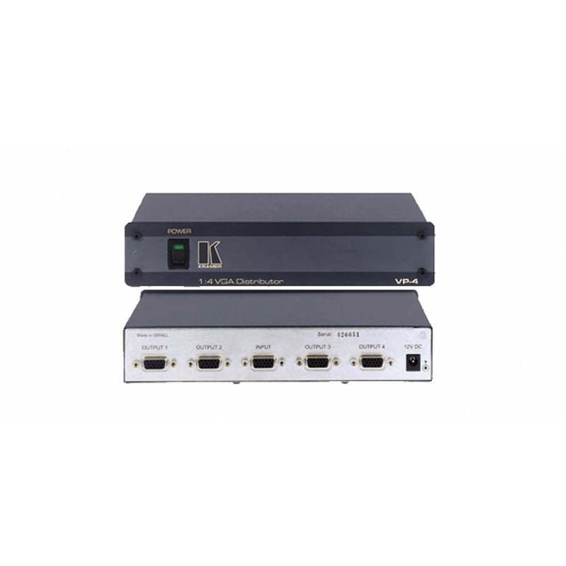 Kramer VA-4 – Распределитель, усилитель VGA, SVGA, XGA 1:4. Распределяет входной сигнал на четыре идентичных выхода (разъемы HD15F). Благодаря полосе пропускания, превышающей 350 МГц, устройство является полностью прозрачным для сигналов высокого разрешения VGA, SVGA, XGA. Вход и выходы – открытого типа. В комплект входит источник питания 12 В. Может использоваться также с устройством VA-50P (опция), которое способно обеспечивать питание 6 устройств Kramer, рассчитанных на 12 В. VP-4 выпускается в надежном и прочном корпусе и устанавливается в стандартную 19” стойку при помощи адаптера RK-80 (занимаемая высота – 2 U).