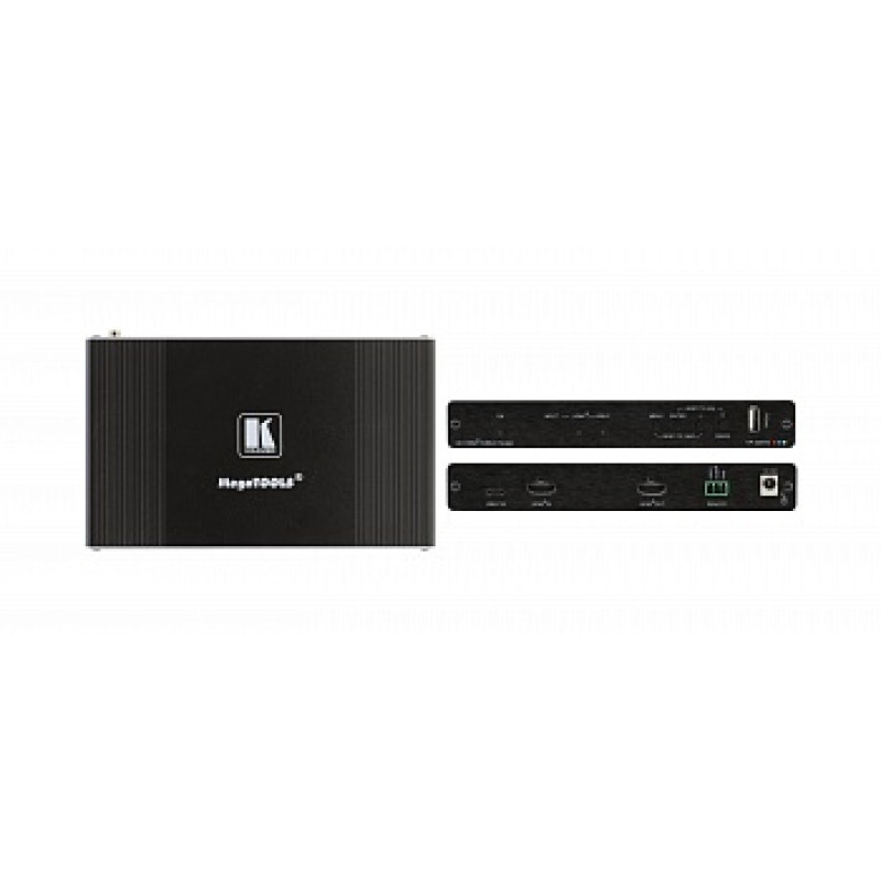 Kramer VP-424C– высококачественный масштабатор сигналов HDMI и USB-C. Прибор производит понижающее или повышающее (до 4K@60 Гц, 4:4:4) масштабирование одного из выбранных видеосигналов. Пользователь выбирает один из двух входов: HDMI или USB-C, и сигнал с выбранного входа после обработки и масштабирования поступает на выход HDMI.