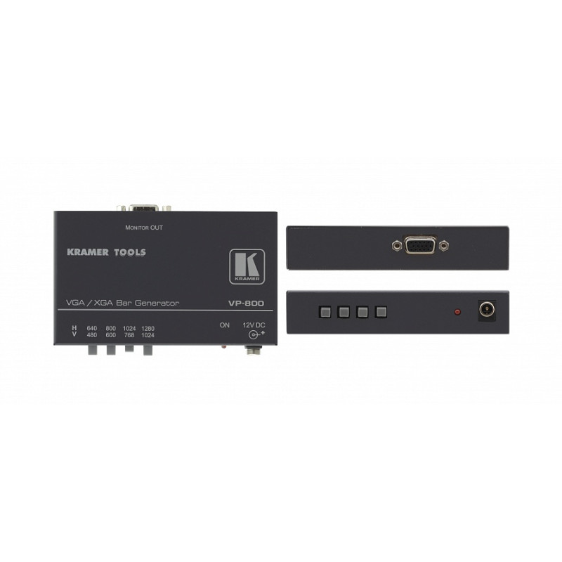 Kramer VP-800 - компактный генератор цветных полос сигналов VGA/SXGA. Этот уникальный прибор создан для тестирования и настройки устройств, работающих с сигналами VGA/XGA (мониторы, проекторы и т.д.). При подключении питания и выборе разрешения (640х480, 800х600, 1024х768, 1280х1024) на выход подается сигнал цветных полос (разъем HD15F). Устройство позволяет избежать использования компьютера или более дорогостоящего генератора тестовых сигналов. В комплект входит блок питания 9/12 В. VP-800 относится к семейству TOOLS - группе компактных высококачественных устройств с оптимальным соотношением «цена/качество» и широким спектром применения.