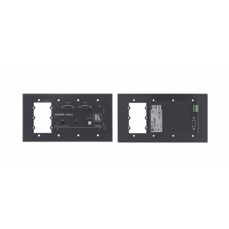 Kramer VPM-2/E – линейный усилитель, преобразователь сигналов VGA/XGA/UXGA. Позволяет подключать к источнику VGA/XGA/UXGA одновременно локальный монитор и дистанционное устройство воспроизведения изображения. Имеет функции буферизации и усиления сигнала для работы с удаленным приемным устройством. VPM-2 способен принимать все стандартные графические видеосигналы (VGA, SVGA, XGA, SXGA и UXGA). Благодаря полосе пропускания 380 МГц он является полностью прозрачным для сигналов UXGA. Модуль имеет проходное гнездо, позволяющее контролировать АЧХ, кнопку для введения идентификационных битов ID Bit в цифровой сигнал и клавишу для активизации дистанционного коммутатора (например, VP-81). Устройство выпускается в двух вариантах: первый – в небольшом корпусе для установки на рабочем столе; второй – со специальным настенным креплением. Оно работает от внешнего источника 12 В и может использоваться во внестудийных условиях. Kramer VPM-2 относится к семейству TOOLS – группе компактных высококачественных устройств с оптимальным соотношением «ценакачество» и широким спектром применения.