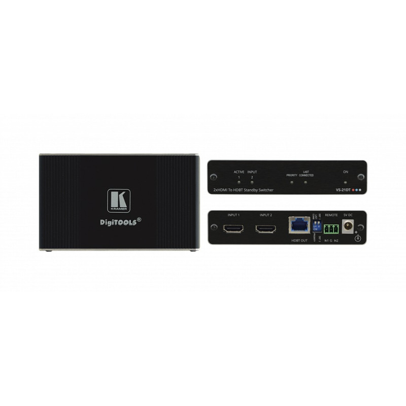 Kramer VS-21DT — высококачественный коммутатор сигналов HDMI cо встроенным передатчиком по кабелю на витой паре по технологии HDBaseT. Прибор переключает входы в автоматическом (по приоритетному или последнему активному входу) и удаленном (замыканием «сухих» контактов) режимах. Выбранный входной сигнал конвертируется в формат HDBaseT для передачи на дальние расстояния.