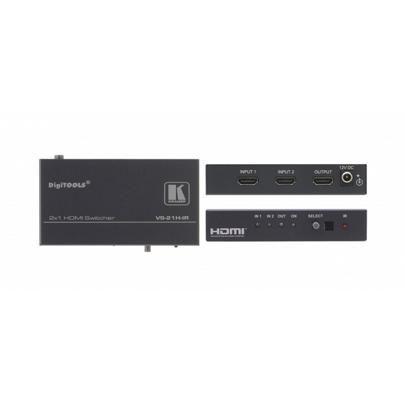 Kramer VS-21H-IR - высококачественный матричный коммутатор сигналов HDMI. Он выдает на выход сигнал с выбранного входа, выполнив его перетактирование и компенсацию АЧХ кабеля.
