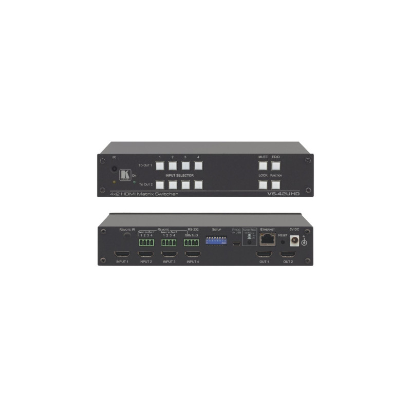 KRAMER VS-42UHD VS-42UHD — высококачественный матричный коммутатор 4х2 сигналов HDMI с разрешением до 4K@60 Гц (4:2:0). Коммутатор выполняет перетактирование сигнала и компенсацию АЧХ кабеля. Прибор позволяет подключить любой из входов к любому выходу или на два выхода одновременно.