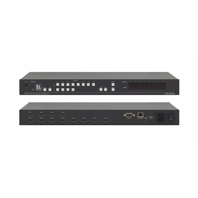 Kramer VS-48HN - высококачественный матричный коммутатор сигналов HDMI. Он позволяет подключить любой из входов к любому выходу или всем выходам сразу. Прибор выполняет компенсацию АЧХ кабеля и перетактирование сигнала. ВНИМАНИЕ! Для гарантии получения правильных результатов (разрешений, видеорежимов, звука) при работе с конкретными дисплеями ОБЯЗАТЕЛЬНО проведите процедуру считывания EDID (см. раздел "Acquiring EDID" в руководстве по эксплуатации прибора).