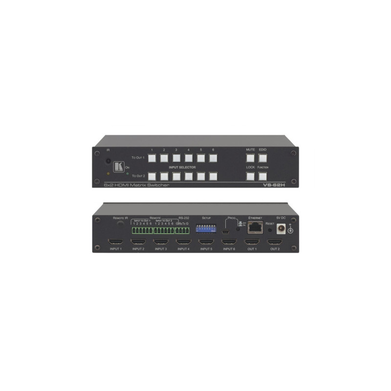 KRAMER VS-62H Kramer VS-62H - высококачественный матричный коммутатор сигналов HDMI. Он позволяет подключить любой из входов к любому выходу или к любому набору выходов. Прибор выполняет компенсацию АЧХ кабеля и перетактирование сигнала. Полоса пропускания прибора позволяет передавать сигналы с разрешением 4K. Дополнительно входы прибора поддерживают технологию Step-In (при использовании совместимых источников сигнала).