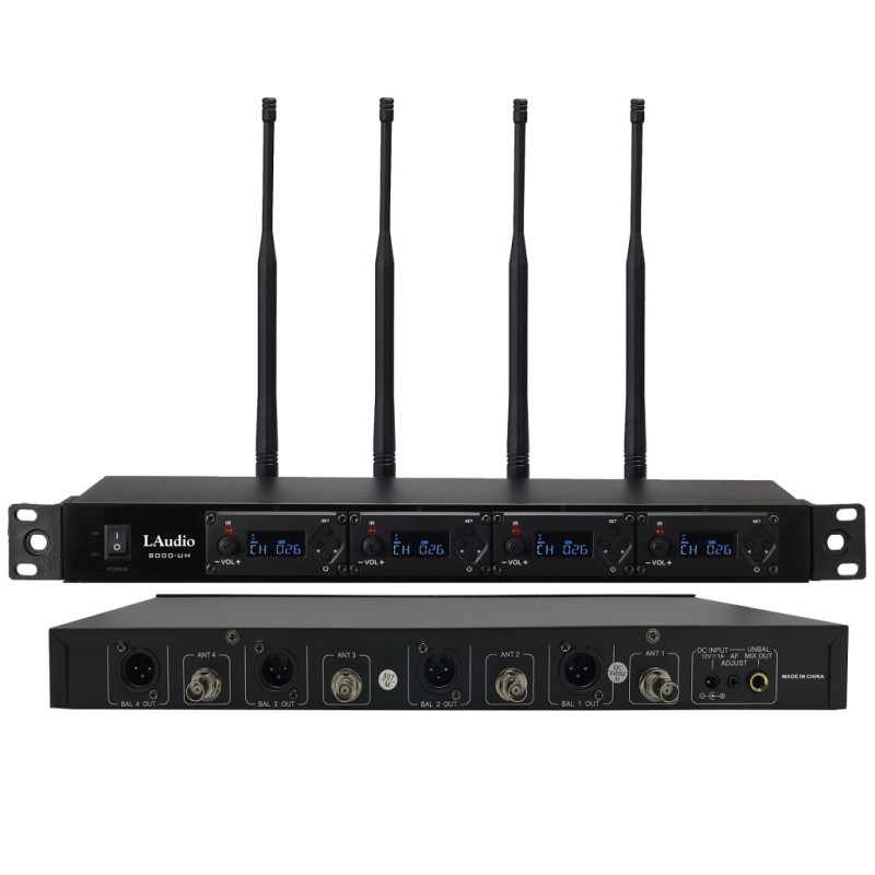 LAudio 8000-UH - 4-канальная беспроводная микрофонная система состоит из 4 наборов независимых модулей УВЧ-приемников с частотами 478-638 МГц.