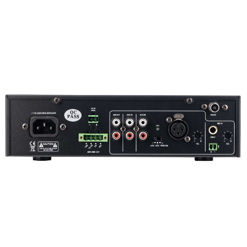Выход на громкоговорители 70 В / 100 В и 4-16 Ом, 3 входа Aux, один микрофонный вход 6,3 мм разъем на передней панели, второй микрофонный вход - XLR на задней панели с фантомным питанием. Индивидуальное управление громкостью для каждого микрофонного и Aux входа, контроль низких и высоких частот. Вход EMC для сигналов чрезвычайных ситуаций.