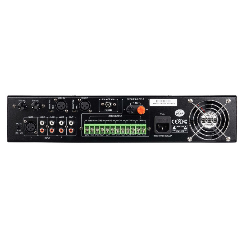 Оснащен выходами на громкоговорители 100 В и 4-16 Ом, 4 микрофонными входами и 3 линейными входами.