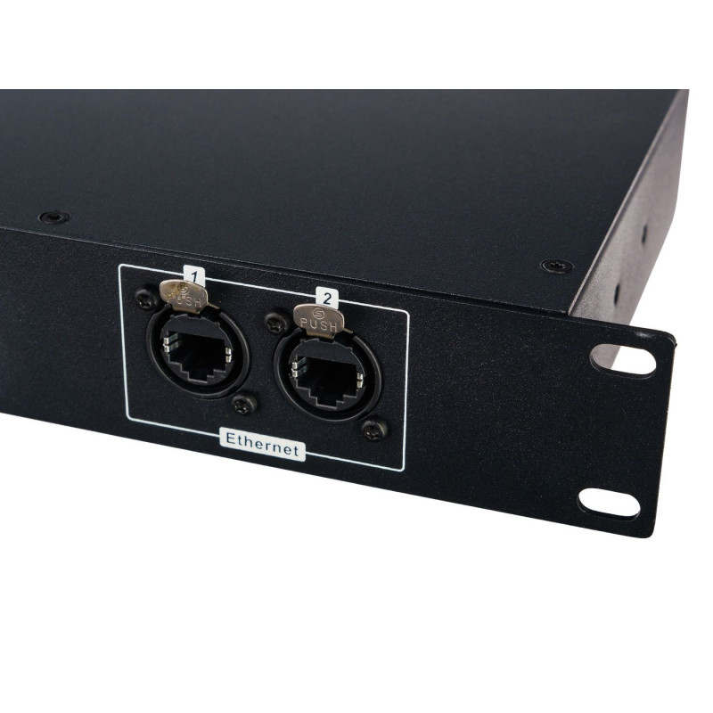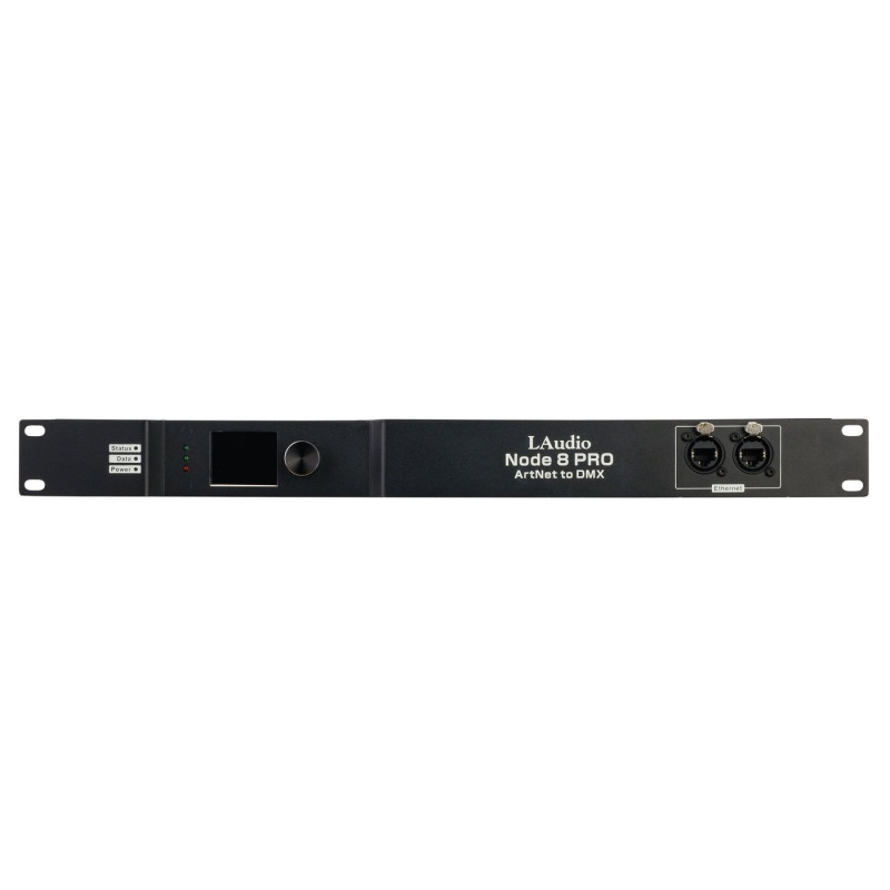 Для коммутации вам доступно два разъема Ethernet, а на обратной панели устройства расположено 8 выходов DMX на коннекторах XLR. Небольшой LCD дисплей обеспечивает интуитивно понятную работу, а установка необходимых параметров осуществляется при помощи одной ручки.