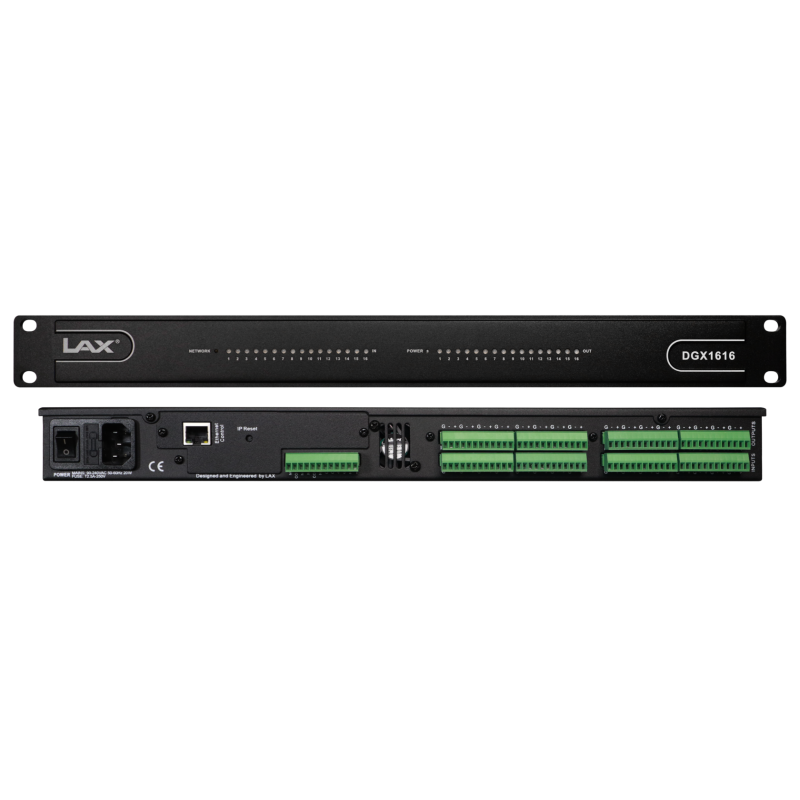 DGX1616 имеет 16 аналоговых аудиовходов, микрофонный (фантомное питание 48В) или линейный, а также 16 аналоговых выходов.