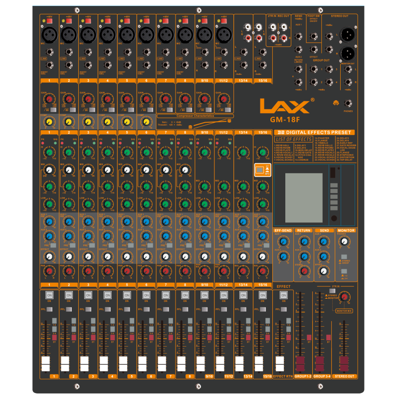 - Входные каналы 1–6 оснащены высокопроизводительным компрессором сигнала