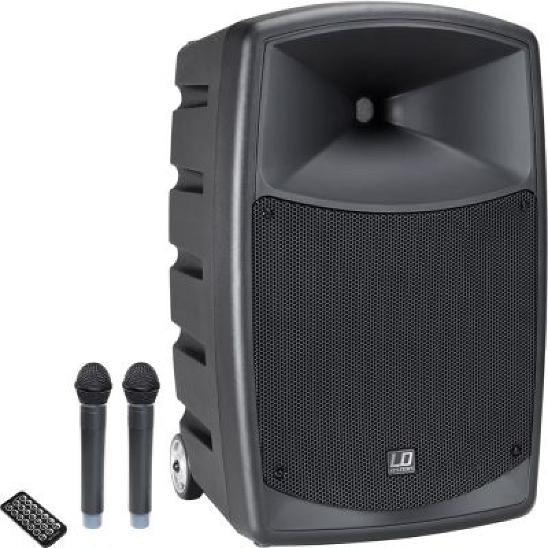 Усилитель мощности класса D с высокоэффективным импульсным источником питания и 480 Вт пиковой мощности нагружен на двухполосный громкоговоритель с 10-дюймовым низкочастотным динамиком и 1-дюймовым компрессионным драйвером и работает от аккумуляторной батареи до 8 часов. Roadbuddy оснащен радиоприемником UHF, работающим в диапазоне 584–607 МГц. Встроенный Bluetooth-плеер с многофункциональным дисплеем с подсветкой, эквалайзером, портом USB и слотом для карт SD поддерживает форматы mp3, wma и wav. В комплект входят два ручных микрофона и ИК-пульт дистанционного управления для проигрывателя. Для проводных устройств Roadbuddy имеет два канала с комбинированными гнездами и индивидуальными регуляторами громкости, которые можно переключать на линейный или микрофонный уровень, стерео вход через разъемы RCA (Cinch) (монофоническое суммирование) и вход Aux 3,5 мм. Регуляторы громкости Treble, Bass, Echo и Master дополняют панель управления. LD Systems Roadbuddy легко транспортируется благодаря встроенным колесам и выдвижной ручке. Сверху находится удобный отсек для хранения до двух ручных микрофонов. Легкий пластиковый корпус спроектирован для установки на штатив 35 мм. Мощность RMS: 120 Вт. Частотный диапазон: 55-18000 Гц. Звуковое давление: 96 дБ. Максимальное звуковое давление: 115 дБ. Мощность передатчиков: 10 Вт. Перезаряжаемые аккумуляторы: 12 В/5 А. Материал корпуса: полипропилен. Размеры (ВхШхГ): 525х415Х328. Вес: 16,5 кГ.