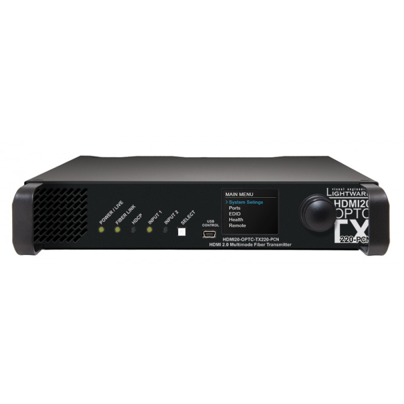 LIGHTWARE HDMI20-OPTC-TX220-PCN Cпециализированный передатчик-коммутатор 2xHDMI 4K (FullHD) по оптике до 700 м (2500м) , поддержка HDMI 2.0 (18 Гбит/с); двунаправленный RS-232; Ethernet; локальный HDMI выход, оптический коннектор типа Neutrik OpticalCON DUO