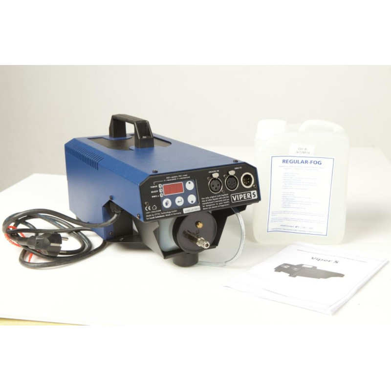 Встроенный таймер позволяет настраивать время задымления в секундах, время ожидания в минутах и выход в %. При активации таймера установленная программа будет выполняться до отключения таймера. Панель управления с LED-дисплеем и простыми символами позволяет легко управлять настройками машины. Она также защищает кнопки управления от загрязнения. Для использования с генератором Viper S предусмотрены следующие оригинальные жидкости для создания дыма: