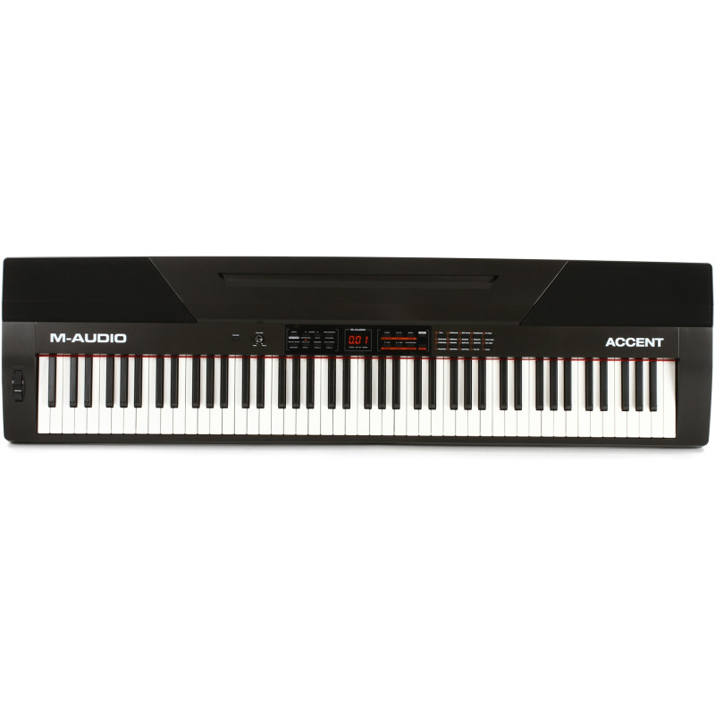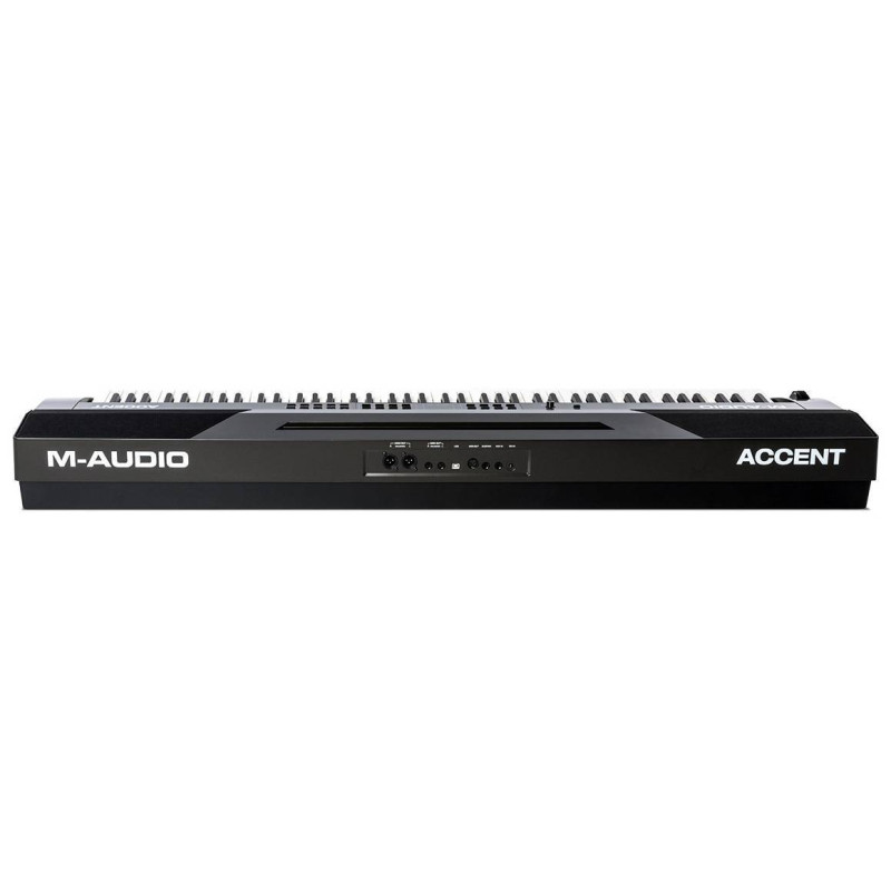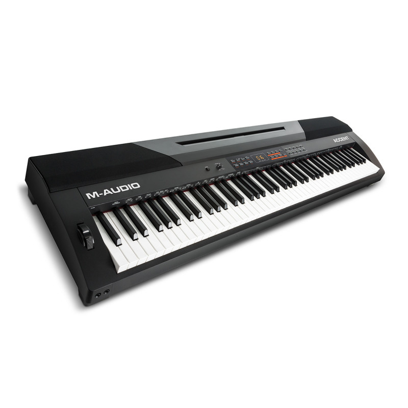 Электропианино M-Audio Accent оснащеон молоточковой клавиатурой, обеспечивающей естественные ощущения игры, и предназначен для использования на сцене, в студии или дома, а также в школах, театрах и так далее. Электропиано Accent может предложить 20 встроенных тембров и DSP-процессор эффектов, а также систему звукоусиления и линейные выходы на профессиональных разъёмах XLR.