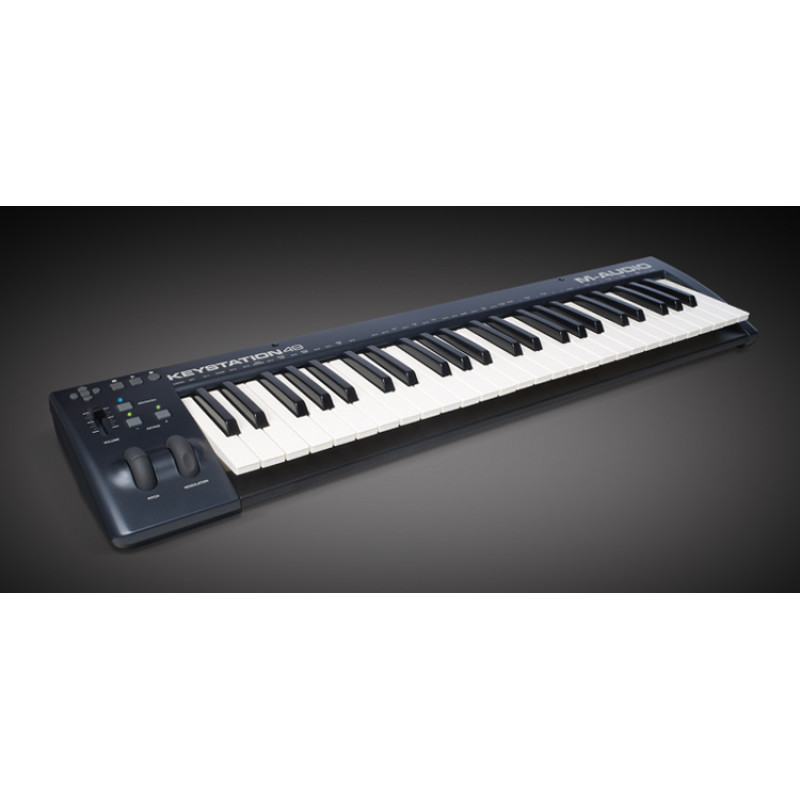 M-AUDIO Keystation 49 II миди-клавиатура, 4-октавная (49 клавиш) динамическая MIDI клавиатура USB, 3 кнопки, 2 колеса (Pitch Bend и Modulation), 1 программируемый фейдер, вход Sustain педали, выключатель питания, MIDI Out, питание 9-12V от USB или от адаптера (в комплект не входит).