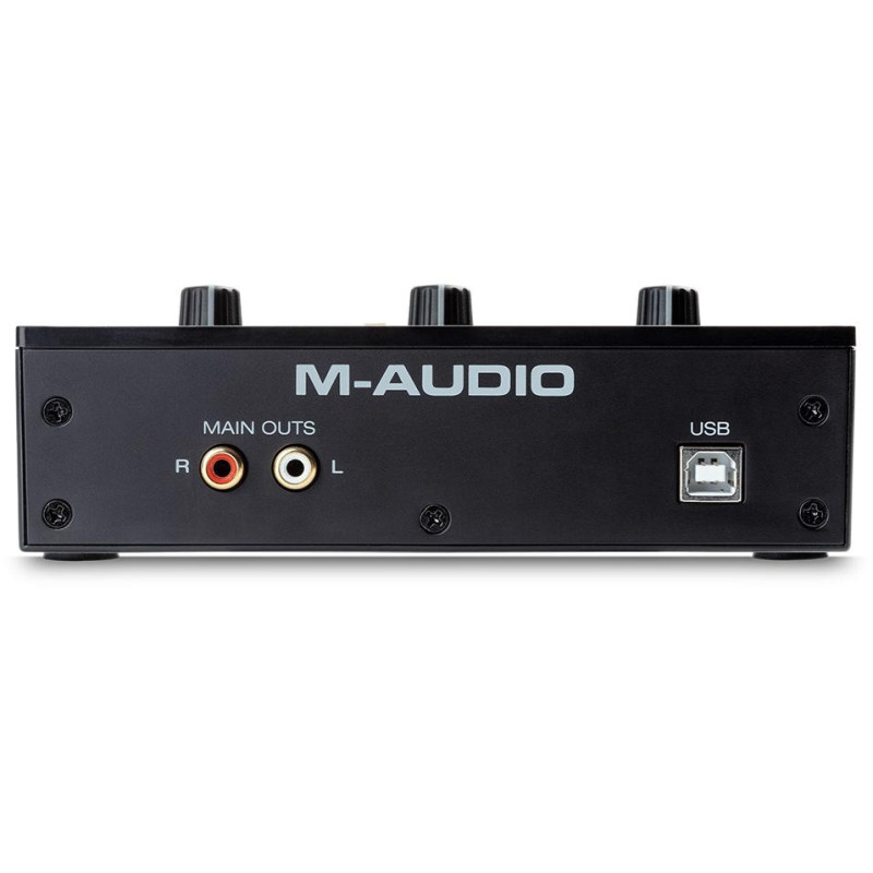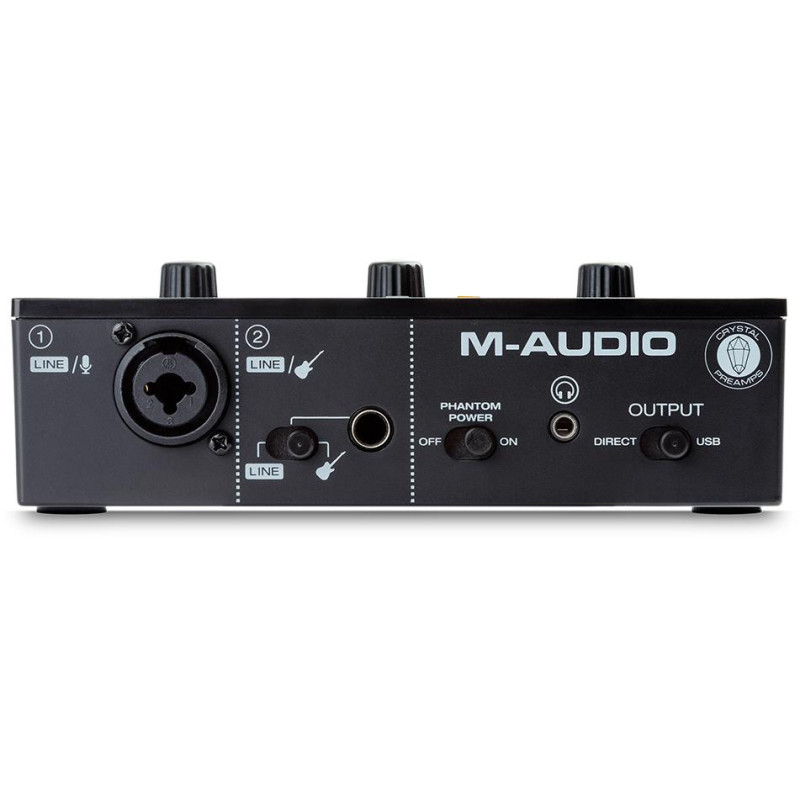 Входные разъемы и выход для наушников находятся на передней панели. Там же располагается переключатель Direct/USB, посредством которого можно осуществлять мониторинг входного сигнала без задержки и оцифровки. Регуляторы громкости каналов и индикация статуса сигнала удобно расположены на верхней части корпуса. Энергообеспечение и подключение происходят с помощью порта USB-B. Среди совместимых операционных систем есть Windows (только 64 бит) и macOS. Комплектация звуковой карты включает в себя USB-кабель и лицензионные ключи для активации программы Pro Tools First M-Audio Edition, а также наборов плагинов и виртуальных инструментов MPC Beats, Air Music Tech Xpand! 2 и Eleven Lite Guitar Amps/FX Modeling.