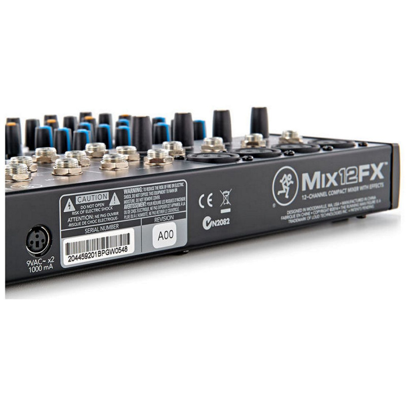 В Mackie Mix12FX входы 1-4 допускают раздельное подключение в микрофонный и линейный каналы, 8 других входов – стереопары на 1/4" TS Jack. На этих же разъемах выполнены выходы, а отдельный выход на наушники с отдельным регулятором громкости - 1/4" TRS Jack. Для всех входов можно применить трехполосный эквалайзер с регулировкой частот 80 Гц, 2.5 и 12 кГц. Для конденсаторных микрофонов доступно фантомное питание. Наконец, в наличии стереопары входов и выходов RCA для записи или воспроизведения с бытовых источников и на них. На первых четырех каналах есть ручки паннинга с индикатором, на стереопарах – ручки регулировки баланса с индикатором. Для контроля звука можно воспользоваться четырёхсегментным двухканальным светодиодным регулятором уровня с секцией клиппинга. Внешний источник питания позволяет использовать микшер во всем мире.